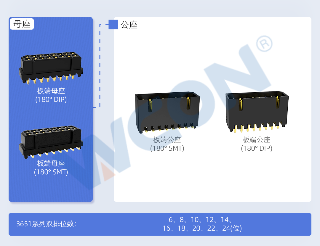 3651系列是一款1.25mm間距小體積、高性能,能為設備提供穩定信號傳輸的板到板連接器。產品帶有定位柱,方便精準安裝到電路板上。有公座 180° SMT、DIP;母座 90° SMT、 DIP等多種形態可配合,36種型號可供選擇。